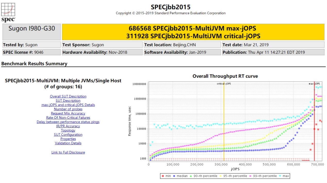 The SPECjbb2015 (Java Business Benchmark) benchmark is a Java application server test by simulating a three-tier architecture environment to measure the performance of application server-side JAVA applications. The SPECjbb2015 test results release must provide the Bops value (Business Operation Per Second), which is how many JAVA business operations are completed per second, and requires complete test environment information.